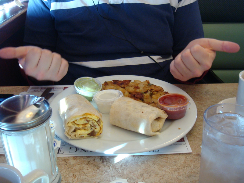 The breakfast menu was varied but familiar. My feeling is they really like flour tortillas, ’cause they had a lot of different variations of a breakfast wrap/burrito available. I stuck by my usual diner breakfast and ordered a spinach and mushroom omelette which came with potatoes and wheat toast (with a little bit of butter), and a cup of coffee.